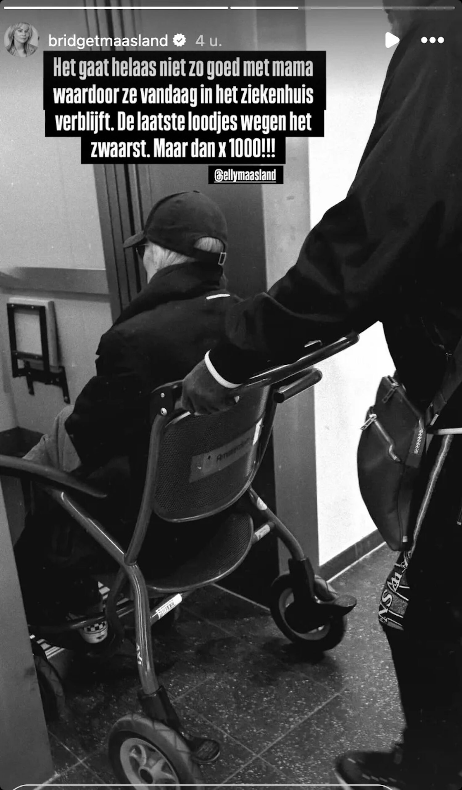 Op een gedeelde foto is te zien hoe Elly Maasland in een rolstoel richting een ziekenhuislift wordt gereden. Het beeld onderstreept de ernst van de situatie en laat weinig ruimte voor twijfel over haar conditie. Bij de foto schreef Bridget: “Het gaat helaas niet zo goed met mama.” Daarmee bevestigde zij dat haar moeder momenteel in het ziekenhuis verblijft en extra medische zorg nodig heeft.